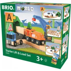 All aboard! Build your first BRIO World with this new lift and load starter set. The layout is packed with machine toys – grab crane, truck, a pop-up hood engine and wagon with load – even a warning sign, spruce and a small mountain to thunder through! Lift the cargo off the truck toy with the crane, turn and load onto the train. Works great with all products within BRIO World.