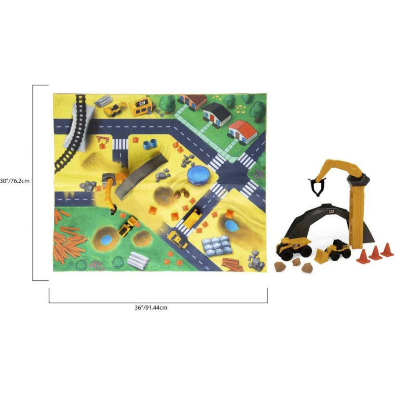 Bring the construction site to life wherever ou are with the Cat Little Machines Construction Mat. Designed for the mini 3” push-powered Little Machines vehicles, the soft and durable printed felt mat lets our child use their imagination to excavate, transport materials, and build around the construction site! The Little Machines Construction Mat includes a working crane, bridge, construction cones, boulders and two Little Machines vehicles for endless fun. Appropriate for ages 3 ears and up.