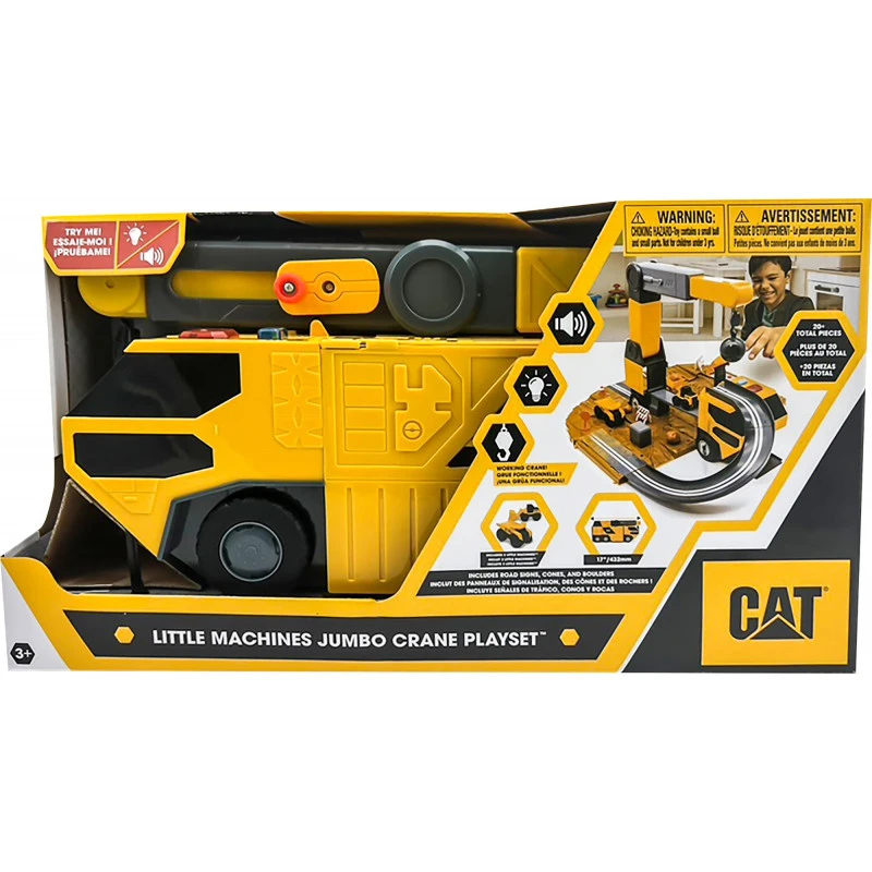 The Cat Little Machines Jumbo Crane Playset is perfect for completing even the biggest jobs. At a massive 17” long this freewheeling crane with realistic lights and sounds allows you to take the jobsite on the go. Once you’re on site transform the crane into a massive 2 foot play area. Featuring a working crane, ramps, a vehicle elevator, dirt terrain floor tiles, road signs, cones, boulders, and 2 Little Machines™ vehicles. Real Cat machines are known for their high quality, these toys are no different, built to withstand the elements and perfect for indoor or outdoor play. Appropriate for ages 3 and up.