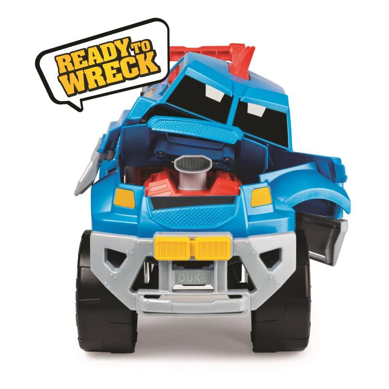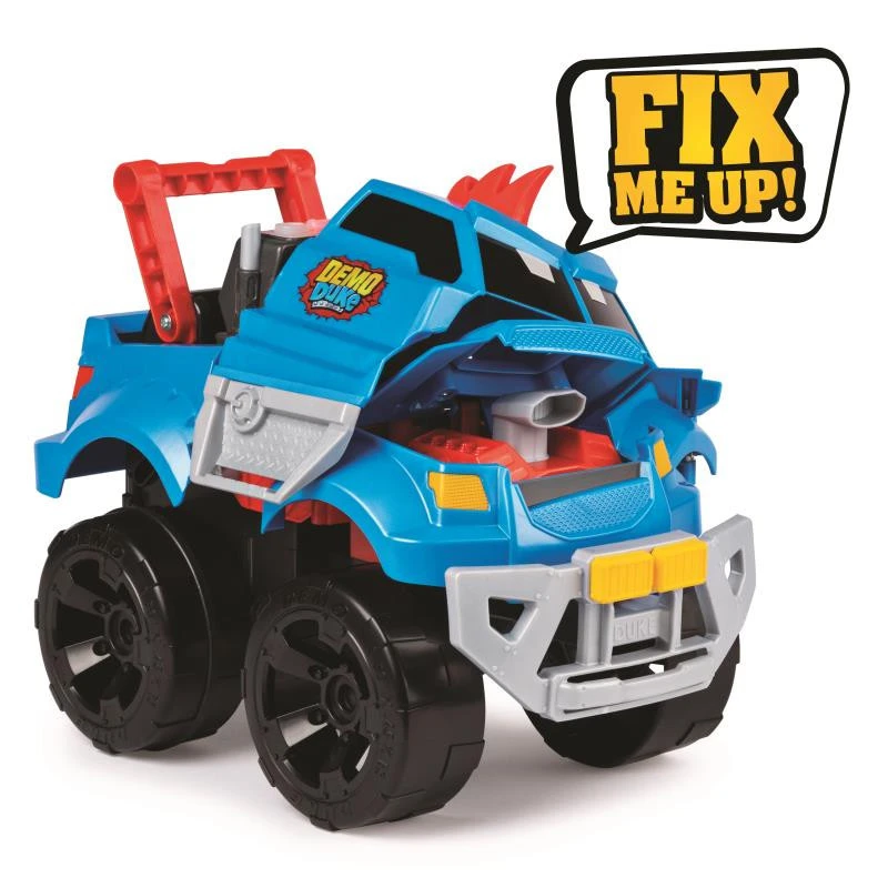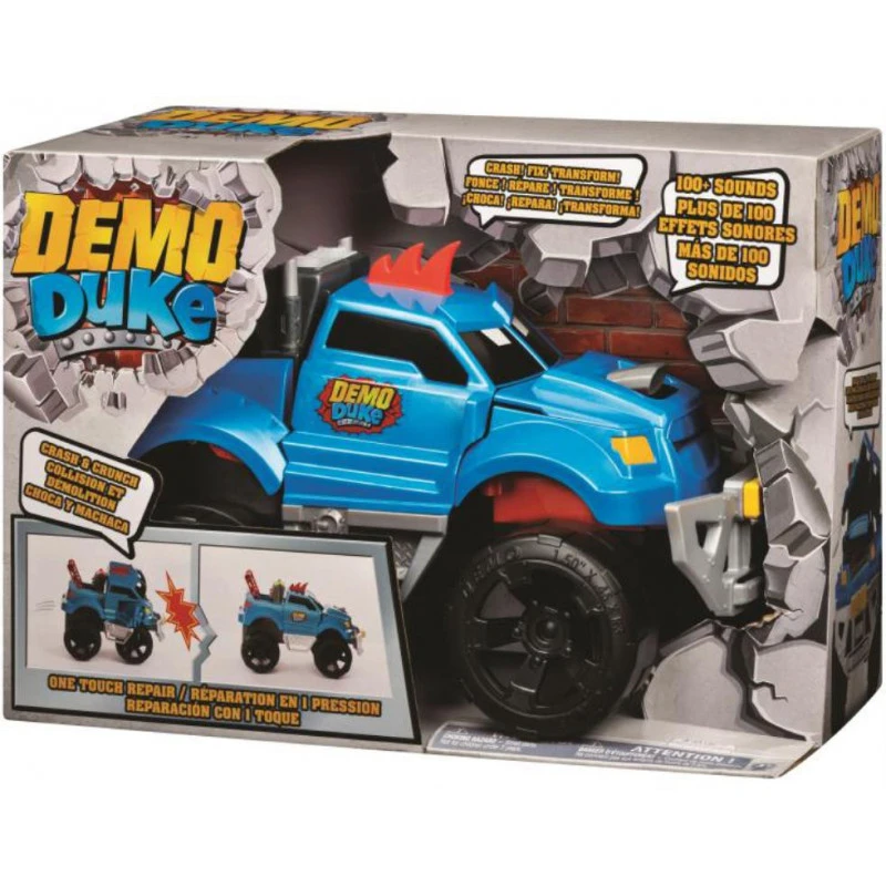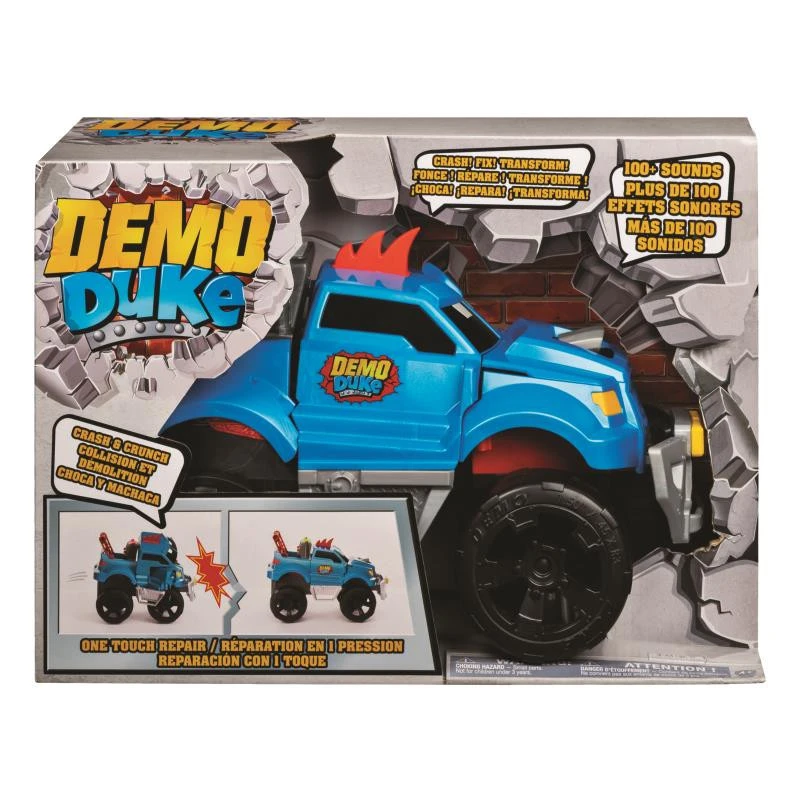 Crash, smash and demolish with Demo Duke, the truck that loves to crash! Demo Duke is easy for kids to use. Line him up for a powerful crash, then push the throttle and let him rip! When he crashes into walls and other objects, he gets more visibly damaged with each smash. When he’s fully crashed, simply fix him with a push of the repair button and Demo Duke will automatically transform back into perfect shape, ready to crash again and again! Demo Duke’s huge personality comes alive with over 100 interactive sounds and phrases, and has a Mohawk your child can touch to hear funny sounds! Demo Duke is safety tested, has durable construction, and a soft bumper so he can crash into anything without damaging your home. Crash, fix, and transform again and again with Demo Duke!