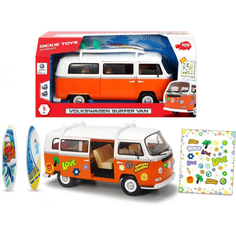 • friction-driven toy van opening doors two removable surfboards stickers license: VW scale: 01:14 length: 32 cm recommended age: 3 years and above