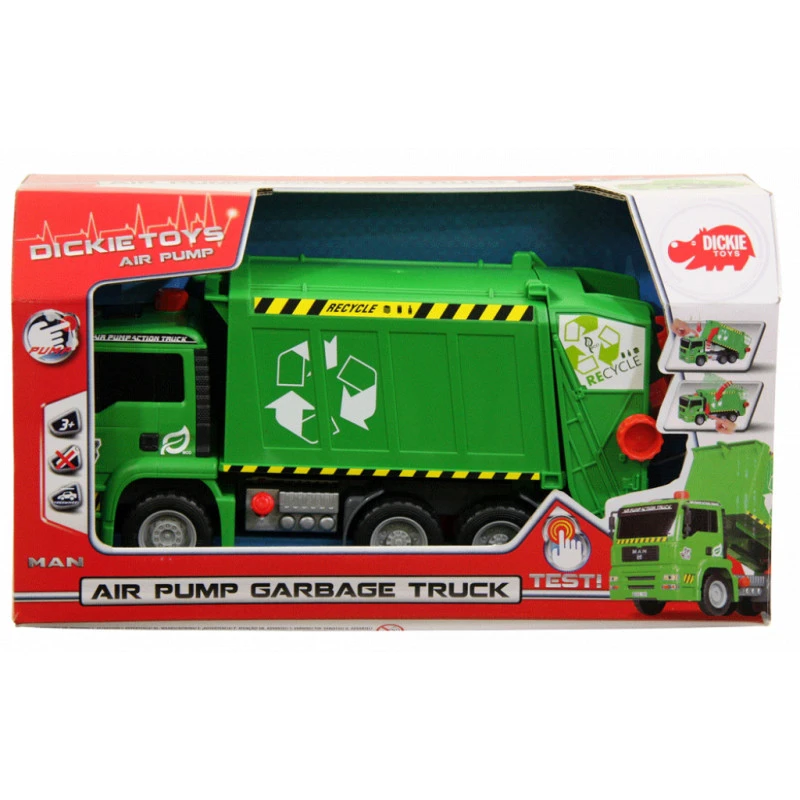 Rubbish collection with a big truck is always fun to watch. Children can recreate this experience at home with the Air Pump Bin Lorry from Dickie Toys. Modelled on MAN vehicles, the green truck is a carefully detailed scale model of a bin lorry. Rubbish can be emptied out of the toy dustbin into the container, which can be raised and lowered by a pneumatic pump system when the young bin men press the knob or operate the lever. This patented technology means that the bin lorry from Dickie Toys doesn’t need any batteries, making it very eco-friendly – how’s that for clever waste recycling?! Teach your children environmentally friendly behaviour through play!