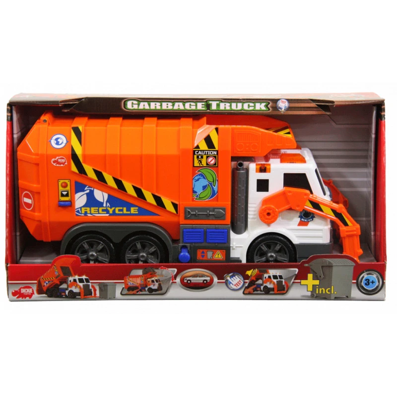 Turn it into precious booty for the young refuse collectors! The orange garbage truck is equipped with a moving fork with dustbin and tipping trailer. Light and sound effects ensure a multifaceted play experience with a realistic feel.