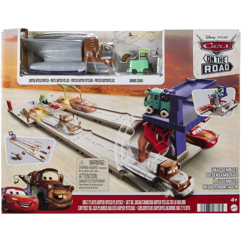 Disney and Pixar’s Cars On The Road Salt Flats Super Speed Playset brings the iconic location home with characters and details from the Disney+ series to create exciting adventures!Let Sara Coggs Pitty vehicle prep the racers and get them ready to compete!Line up Super Speed Mater vehicle and his competition (other vehicles sold separately) at the start, and with a push of a button watch them dash to the finish!®