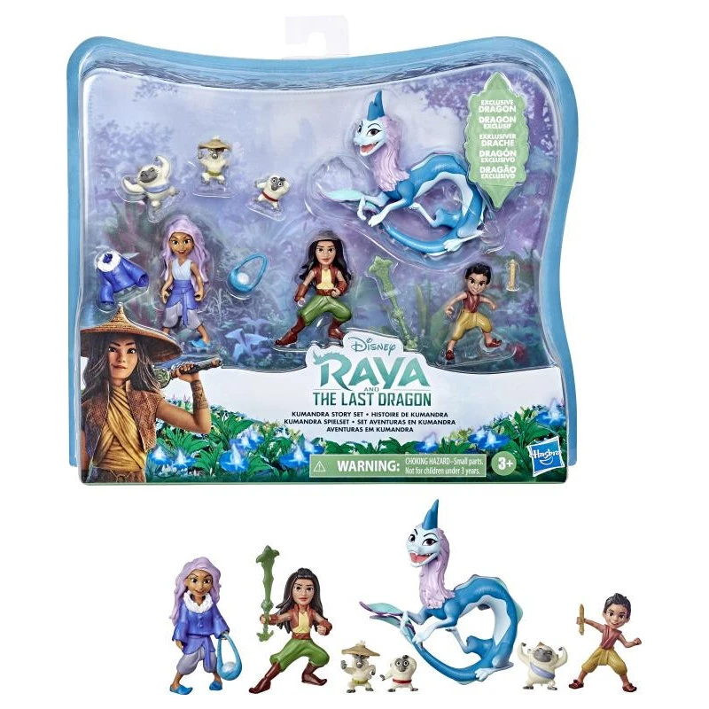 The Kumandra Story Set includes a Raya doll, Sisu Human doll, Sisu Dragon figure, a Boun doll, and 3 stackable Ongis figures. All the dolls wear molded movie-inspired outfits and include awesome accessories so kids can reenact movie scenes or create stories of their own. Accessories include a sword, satchel, jacket, flute, and hat. The Sisu Dragon figure’s body has a pearlescent finish, a design only found in this set!