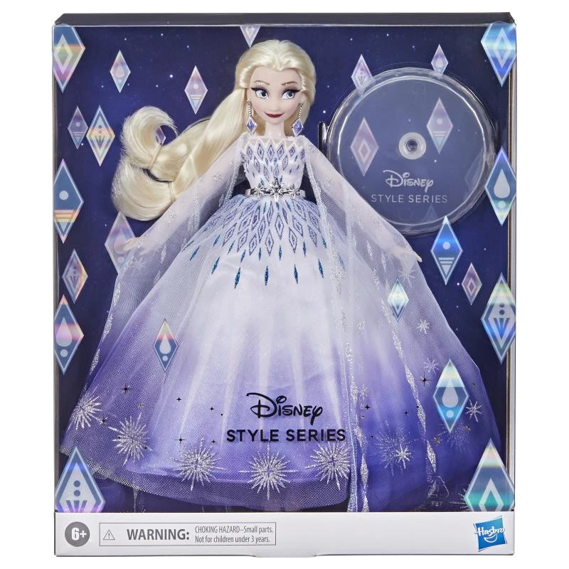 Elsa’s style shines bright as new-fallen snow in a white-to-cool-blue ombre gown inspired by her unforgettable journey of discovery. The fashion doll’s flowing dress shimmers with sparkling snowflake accents reminiscent of the movie’s wintery details. Completing Elsa’s outfit is a translucent cape and icicle-inspired shoes, earrings, and belt. The collector doll itself features articulated elbows and wrists, as well as long rooted hair and eyelashes. There’s also a display stand to show off this collectible doll. Look for more Disney Princess Style Series dolls like Ariel, Belle, Rapunzel, and Tiana too. (Each sold separately. Subject to availability.) Copyright Disney. Hasbro and all related terms are trademarks of Hasbro.