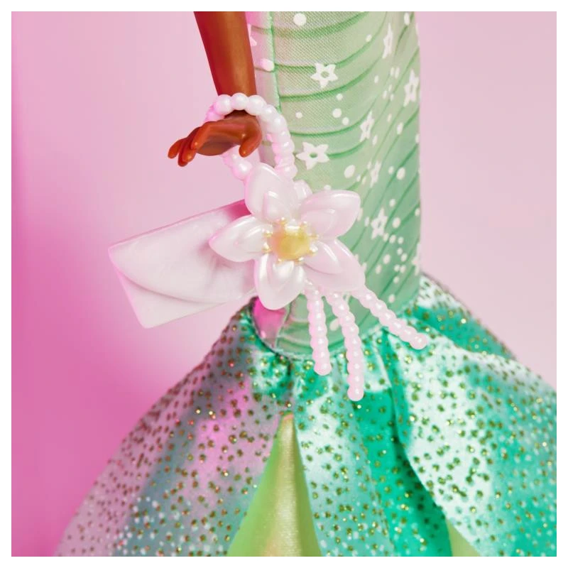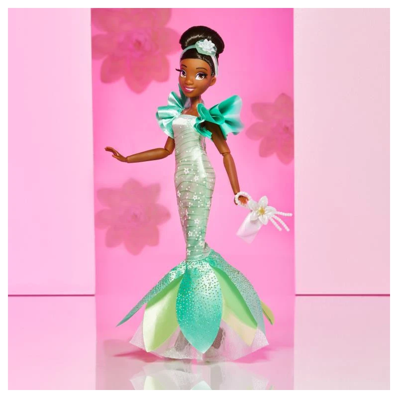 Her gown, inspired by the gardens of New Orleans, features shades of green and flares below the knee in a leaf pattern bedazzled with flowers and sparkles, while a removable pair of shoes, purse, and water lily headband tie the ensemble together. Her effortless style will remind fans of Tiana’s grace and determination as she fulfils her dreams. Fans can collect other dolls in the Disney Style Series too.