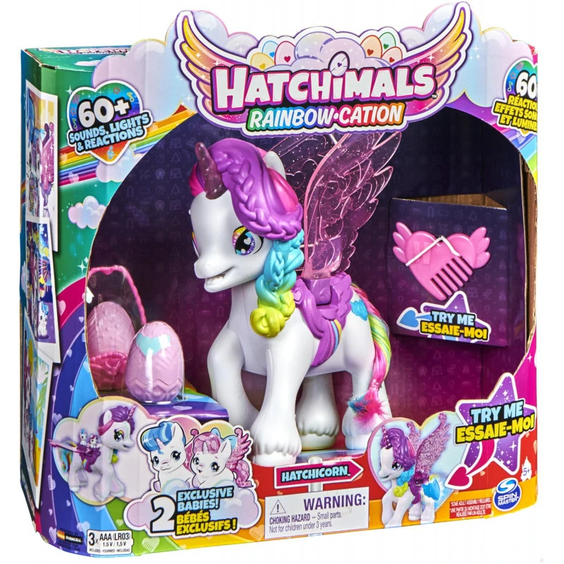 Soar through the sky with the Hatchimals CollEGGtibles Hatchicorn! This interactive Hatchimals unicorn features over 60 sounds, lights and reactions and has glittery wings that light up and really flutter! She comes with two exclusive Twin Babies, a basket and a comb to brush her soft rainbow tail. Crack into each Hatchimals egg to reveal one of three possible pairs of the most adorable unicorns! Then, sit them on Hatchicorn’s saddle to see how she’ll respond – she has a unique reaction for each Baby! Lift her up to take flight on your adventure, and she’ll begin to flap her wings and make noises as her horn and wings change color! As you play together, Hatchicorn recognizes different flight patterns. Tilt her up to make her wings quickly flutter or tilt her down for a slow glide! As she flies, her horn and wings continue to change color. It’s so much fun! Place the Babies in the basket and when the handle is in Hatchicorn’s mouth while she’s flying or on a solid surface, you’ll hear happy noises as her horn and wings light up again! For even more reactions and surprises, fill the basket with the Babies or other CollEGGtibles characters (toys sold separately) and place it on her back; press her hip button while she’s flying or press it while she’s on the ground to hear a special song! With all of her exciting features, Hatchicorn is perfect for pretend play storytelling. Create your own adventures again and again! Hatchicorn and Hatchimals CollEGGtibles surprise toys for girls are perfect for kids who enjoy cute collectibles, action figures, dolls, and small toys. They make great birthday gifts for kids, Christmas gifts, stocking stuffers, Easter basket stuffers and more! Includes 3 AAA batteries. Experience magical adventures with the interactive Hatchimals CollEGGtibles Hatchicorn! INTERACTIVE TOY UNICORN: Adventure through the sky! Hatchicorn has over 60 lights and sounds, flapping glittery wings, a rainbow tail you can brush with her comb, 2 exclusive Twin Babies and a basket they can ride in! OVER 60 LIGHTS, SOUNDS, REACTIONS: She flaps her wings when you lift her, knows when the basket is in her mouth, reacts to her Babies and so much more! Press her hip for a song when she’s not flying! UNIQUE FLIGHT PATTERNS: Hatchicorn recognizes flight patterns! Tilt her up for a fast flutter of her wings and tilt her down for a slow glide through the air. Her horn and wings change colors! Batteries included. BASKET OR SADDLE PLAY: Place the Babies in the basket and put it in her mouth, place it on her back or fill it with other characters! Sit each Baby on her saddle to discover reactions for each unicorn! SURPRISE TOYS FOR 5 YEAR OLD GIRLS AND UP: Hatchimals toys & games, toy figures & playsets, flying toys, dolls & accessories are the perfect gifts for 5 year old girls and up. Collect them all!
