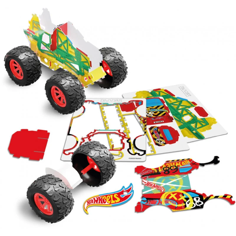 Pop out the plastic parts to build your Hot Wheelsâ„¢ Twin Monster Trucks. Once assembled, the Monster Trucks are robust and feature double pull back motors for awesome high speed racing. Does not require scissors, glue or batteries. Double pull back. 4WD power. Stunt ramp included. Suitable from 6+