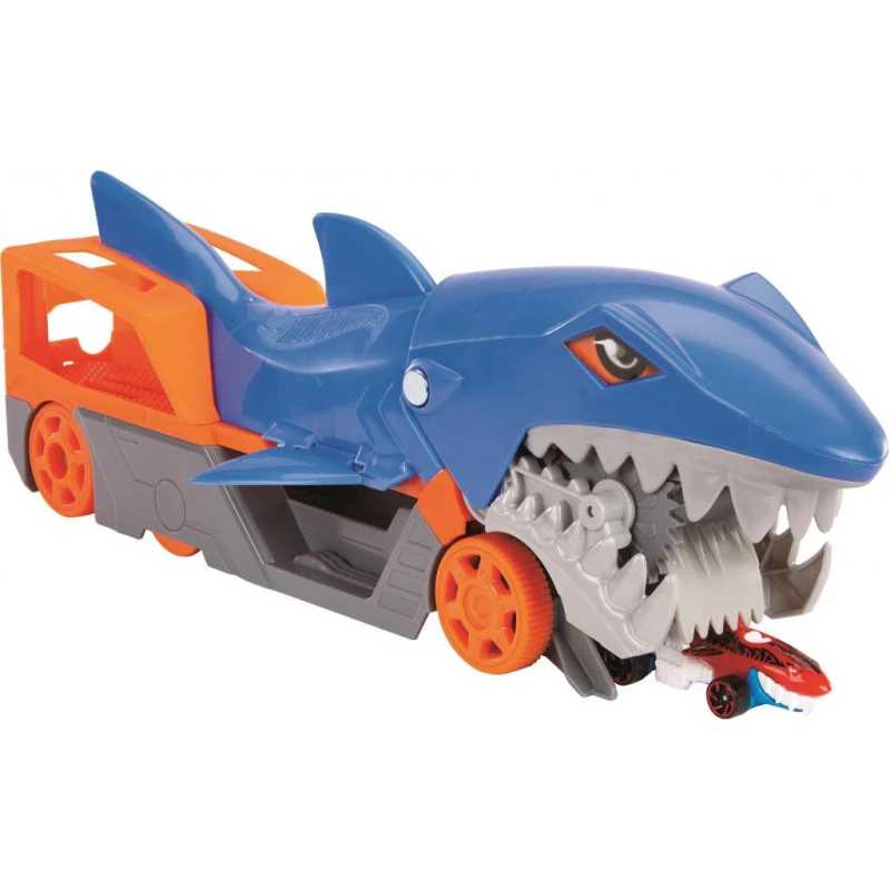 This super-cool shark-inspired hauler gobbles up cars and stores them in its belly for a unique and fun way to transport and store Hot Wheels vehicles.