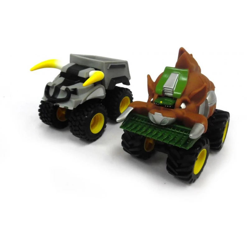 Monster Treads are now taking the off-road action to a new level with ‘2 n 1’ play! Turn your Monster Tread tractor into a stylized monstrous buck or your Monster Tread gator into a fierce Rhino with pliable ‘farm armor’ that is easily removed! This ‘2 n 1’ play brings creativity and excitement onto the farm scene with monster tires and ‘farm armor’!.