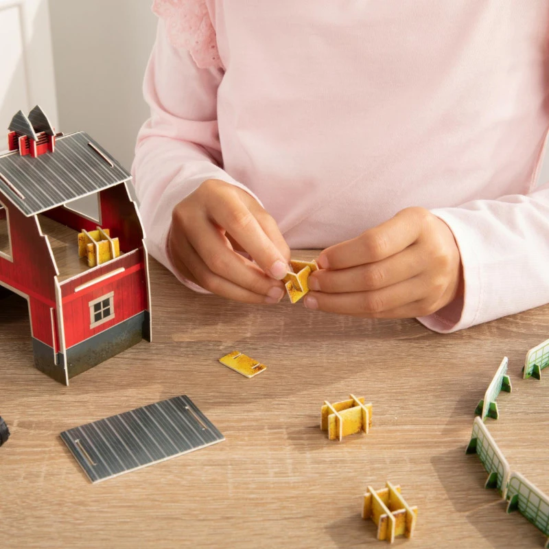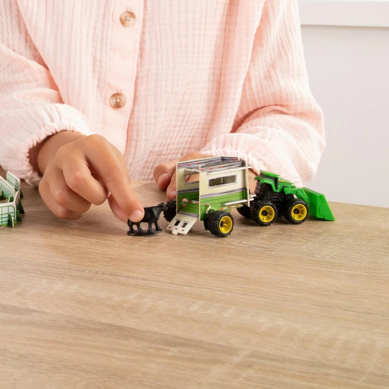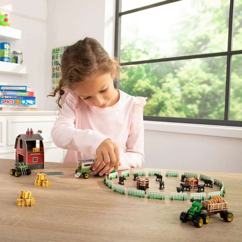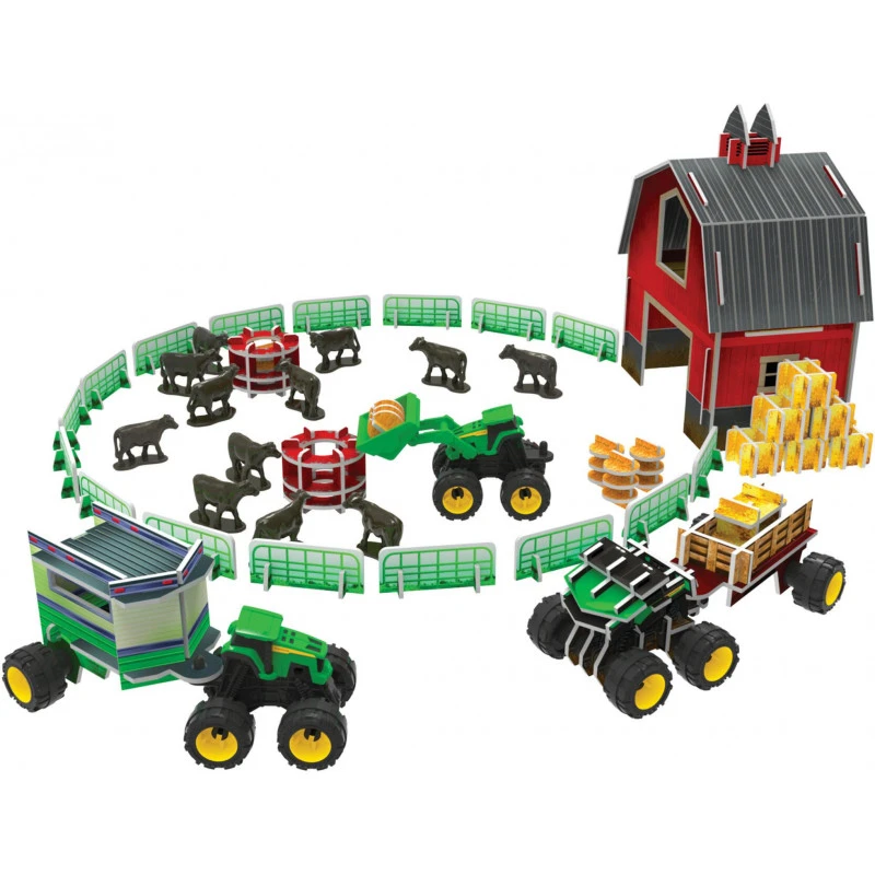 Officially licensed by John Deere, young farmers can now build their own farm with this John Deere Farm Toy Play Set. Packed full of fun, the set includes 203 sturdy pieces that allow you to build a barn, bales, fencing and more! Once kids have created their very own farm, they’re ready for imaginative play as they use the toy tractors and gator to get around the farm. The tractors feature free rolling wheels for plenty of push along fun. Twelve cows round out this play set, making it a real treat for farm toy fans six years and up. This fully stocked farm set features 203 pieces total: 2 Plastic tractors, 12 plastic cows, and 157 paper parts. What can be made from the paper parts: one barn, 18 fence pieces, 1 gator vehicle, 1 livestock trailer, 7 square hay bales, 5 round hay bales, 2 hay feeders, and 1 stake wagon. Features: – Toy Farm Set: Get ready to inspire hours of creative play with this John Deere toy farm building set featuring 203 pieces that will spark kid’s imaginations – Puzzle it Together: Kids will love putting the sturdy pieces together to build multiple fun farm items including a barn, gator, livestock trailer, fencing, and more – Tractor Toy: Toy set features two tractors with free rolling wheels as well as a gator to help young farm fans get the job done; there’s even a barn to park them! – Toy Animals: Twelve cows round out the set, use the included fencing pieces to keep them together and feed them from the hay feeders – Officially Licensed John Deere Product: Produced by TOMY — Our mission is to make the world smile!