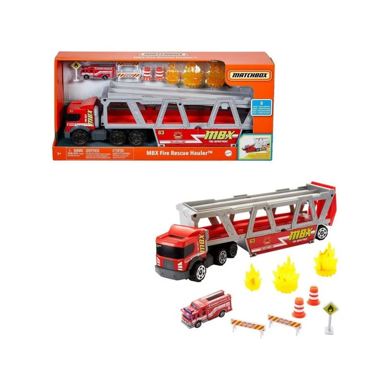The Matchbox Fire Rescue Haulerâ„¢ is a multifunctioning vehicle that inspires kids to create their own heroic and life-saving adventures! It comes with one 1:64 scale fire-themed truck and can hold up to 15 more (sold separately), with a ramp out the back for easy access. It also includes eight super cool fire-related accessories that can easily be stored in a designated cabin beneath the transporter. It’s the ultimate in fire-department themed haulers. Colors and decorations may vary.