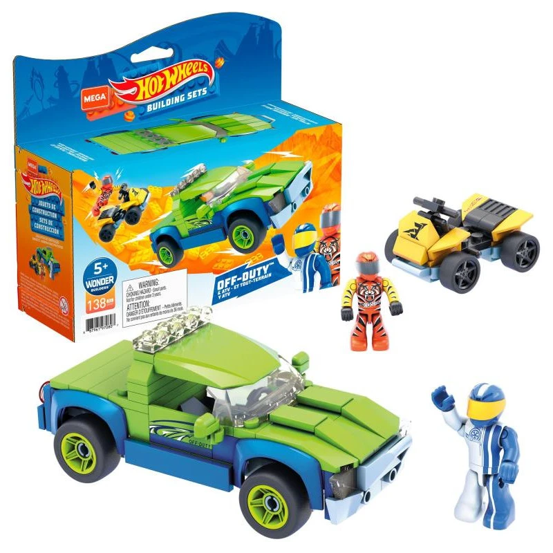 Experience double the racing fun with 2 buildable Hot Wheels construction sets that feature both a racer and kart. Choose between Track Ripper & Kart, Off Duty & ATV, or collect the series. Each set comes with 2 vehicles and features authentic Hot Wheels details. Combine the included bricks and pieces from both vehicles and any Mega Construx building sets to build your own custom cars. Each sold separately. Themes and details may vary. Ideal for Wonder Builders, ages 5 and up
