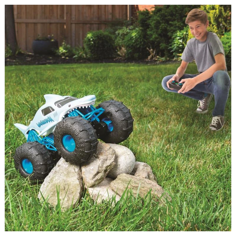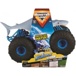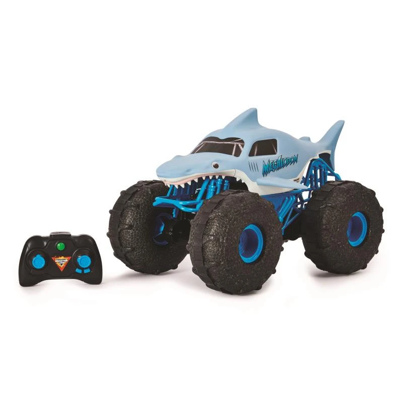 Experience all-terrain performance with the official Monster Jam Megalodon STORM RC! This 1:15 scale remote control Monster Jam monster truck drives on water and any terrain with amazing performance and speed. The Megalodon STORM puts the Monster Jam action in your hands and gives you the power to conquer snow, mud, rocks, and grass. With a water-resistant body and lightweight custom tyres, the Megalodon STORM can race on water, then switch to land and keep on going.