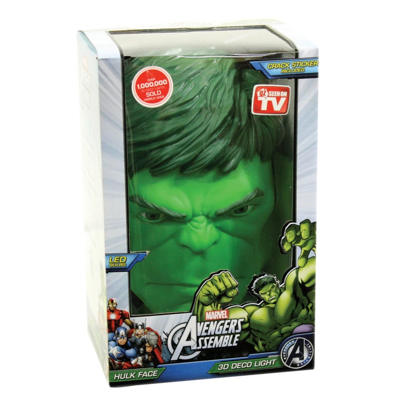 Hulk can smash right through your wall with this 3D Deco Light of his face. His entire face will glow green when turned on, and the use of the cracked image sticker really adds to the effect of having the Hulk smashing through your wall. The light runs on