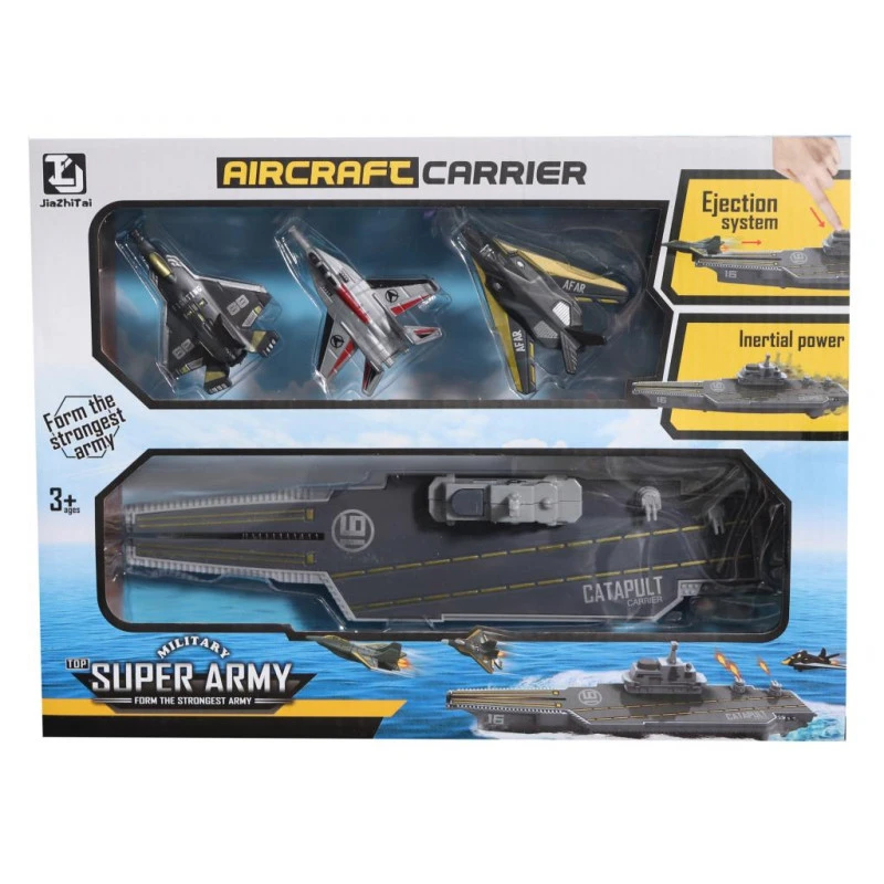 This 24cm aircraft carrier model has a working catapult, 2 rotating guns, 3 planes and is friction powered.