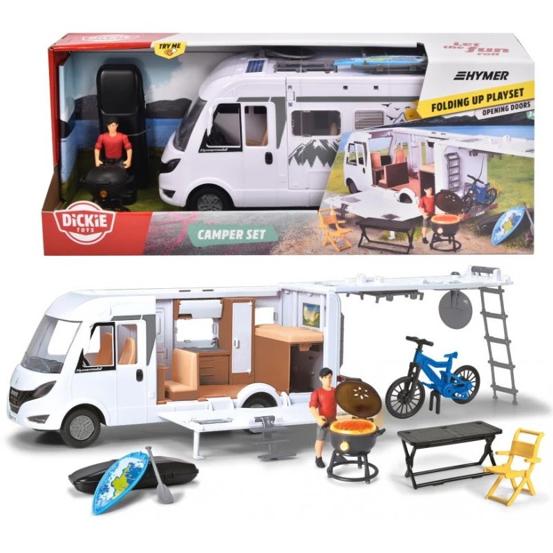 Time to go on holiday in the spacious Hymer Camping Van! This highly-detailed toy camper van from Dickie Toys features free-rolling wheels and is guaranteed to keep your little one entertained. Once you’ve found a suitable camping place, you can fold down the side panel of the camper van and get started: Who wants to set up the table? Who will take care of the barbecue? And who will get the surfboard from the roof box? Designed for children aged 3 and above, the toy camper van has a highly-detailed interior and comes with numerous accessories that are ideal for role play. The roof side panel and roof window can be easily opened by inexperienced hands. The van also comes with a movable toy figure. The Camper Set helps to train fine motor skills and is guaranteed to inspire all sorts of role-play scenarios. Ideal for use at home and on holiday – order the B-Class Hymer Camping Van and fulfil your little one’s dream of owning their own camper van! • Push-along B-Class Hymer camping van with rubber tyres • Opening roof, side panel, roof window, cupboard doors and camper doors • Includes movable figure • Detailed interior – just like a real camper van • Numerous accessories: Table set, barbecue, surfboard, bicycle, roof box • Length: 30cm • Scale: 1:24