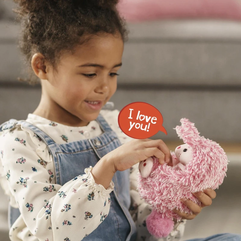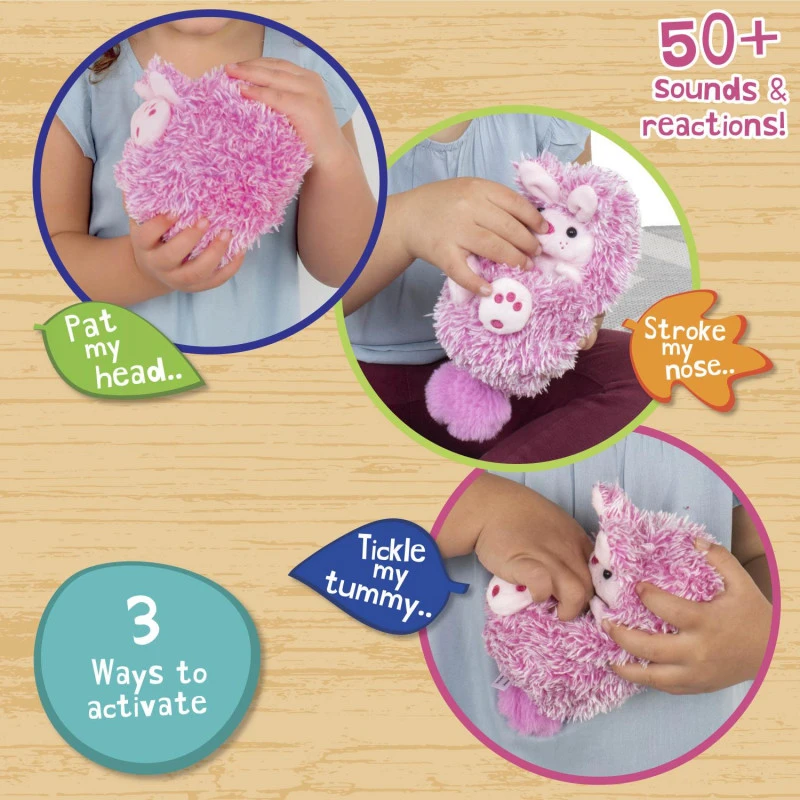 Uncurl the cuteness! Curlimals are super cute interactive plush friends that react to you. Bibi is such a bouncy little Bunny! She lives in a cosy little burrow at the foot of the oak tree. She’s fun, lively, and laughs at everything. Pat her on the head to hear super sweet sounds and phrases. Stroke her nose to hear her sneeze and tickle her tummy to hear giggles and laughter. When playtime is over, she will curl up into a ball and as she falls asleep, you’ll hear snoring sounds. Requires 3 x AAA batteries.
