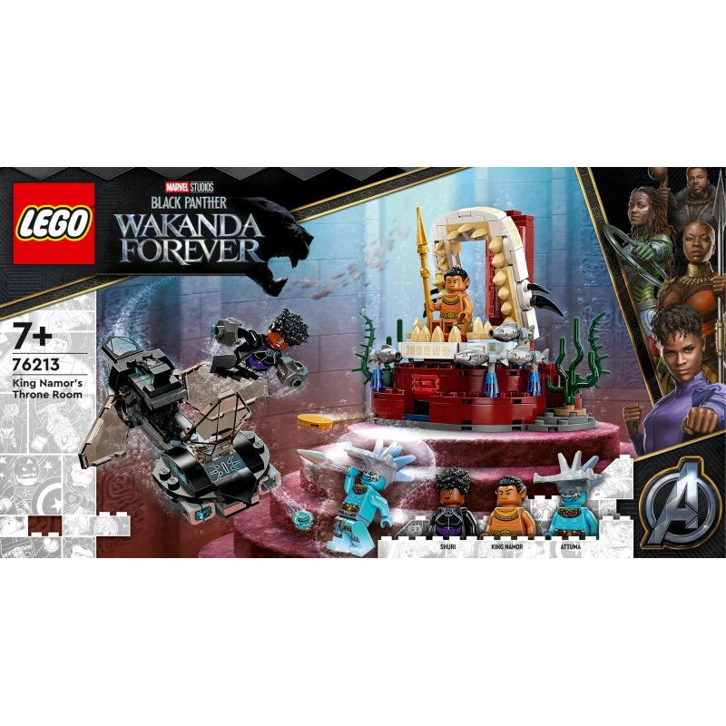 Imaginative underwater action awaits young Super Heroes aged 7 and up in the LEGO Marvel King Namor’s Throne Room (76213) set. Submarine adventures for Black Panther fans. The sleek and stylish recreation of the Skirmisher submarine from Marvel Studios’ Black Panther: Wakanda Forever features stud shooters that kids can fire as they battle the villain Attuma. At the end of the sub’s journey, they’ll discover the Temple of King Namor and the King’s seaweed-decorated throne room. When this mission is over, kids return to the submarine and set off on the next of many more underwater adventures. The set includes 3 minifigures – Shuri, Attuma and King Namor – along with their cool weapons and accessories.