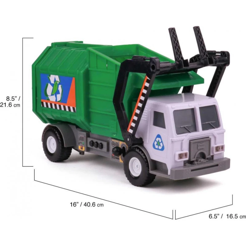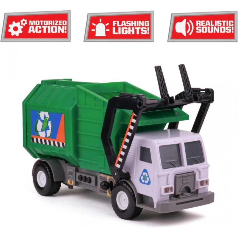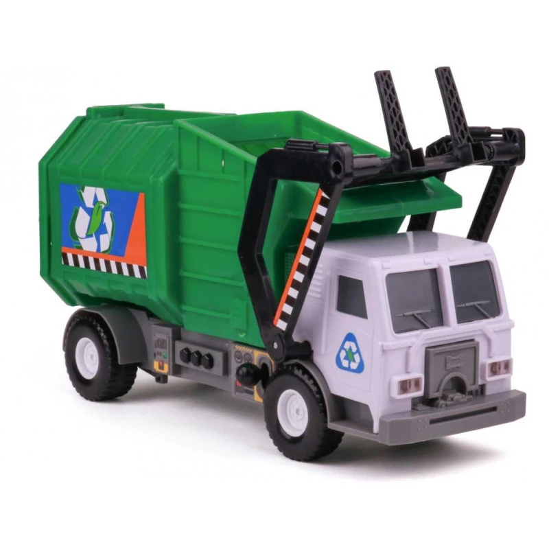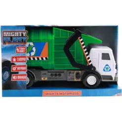 Motorised Action The Mighty Fleet Mighty Motorised Garbage Truck has all the cool features of the real thing, including a motorised front power arm for loading! The levers on the side control the front power arm and sound the horn. Flashing Lights and Sounds Realistic sounds and hyper-lighting are activated at the push of a button. Educational Value Build sensory development and fine motor skills while encouraging creativity and learning through play.