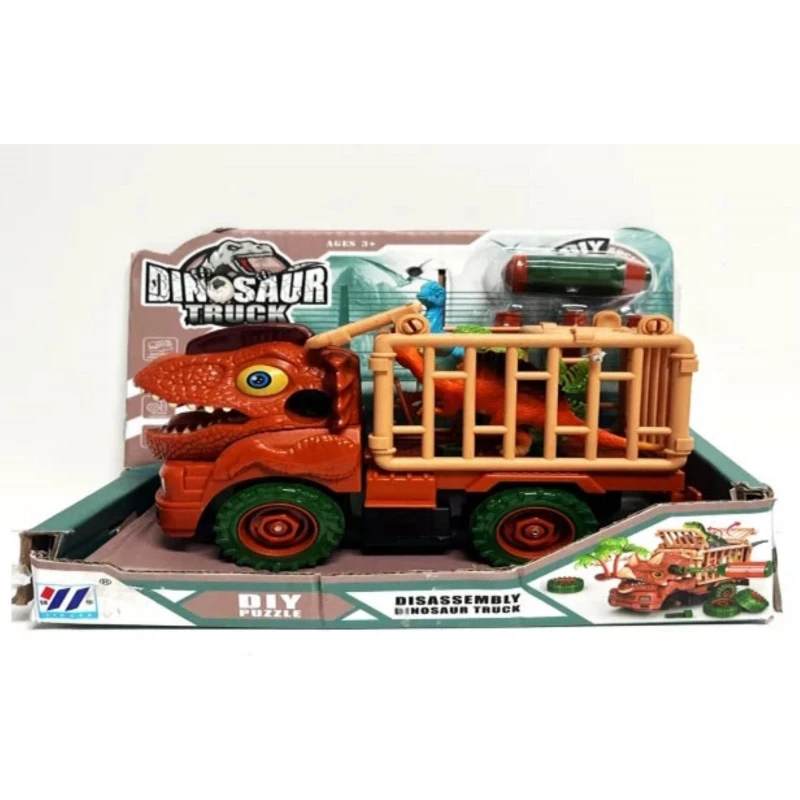 Plastic freewheel truck with dino head. The cage on the back has two dino models and a tree. Includes tools for pull apart function
