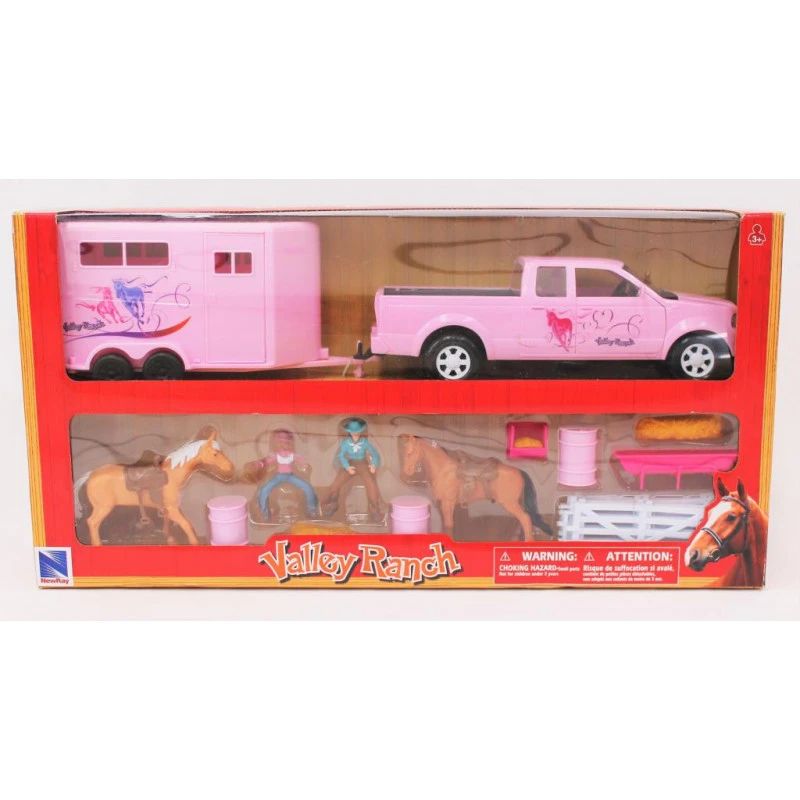 Time for some horseback riding adventures! You and your mate can head off in your dual cab truck with horse float for your trusty steeds attached. Set also comes with fencing, feed and water trough and three 24 gallon drum jumps, in pink of course!