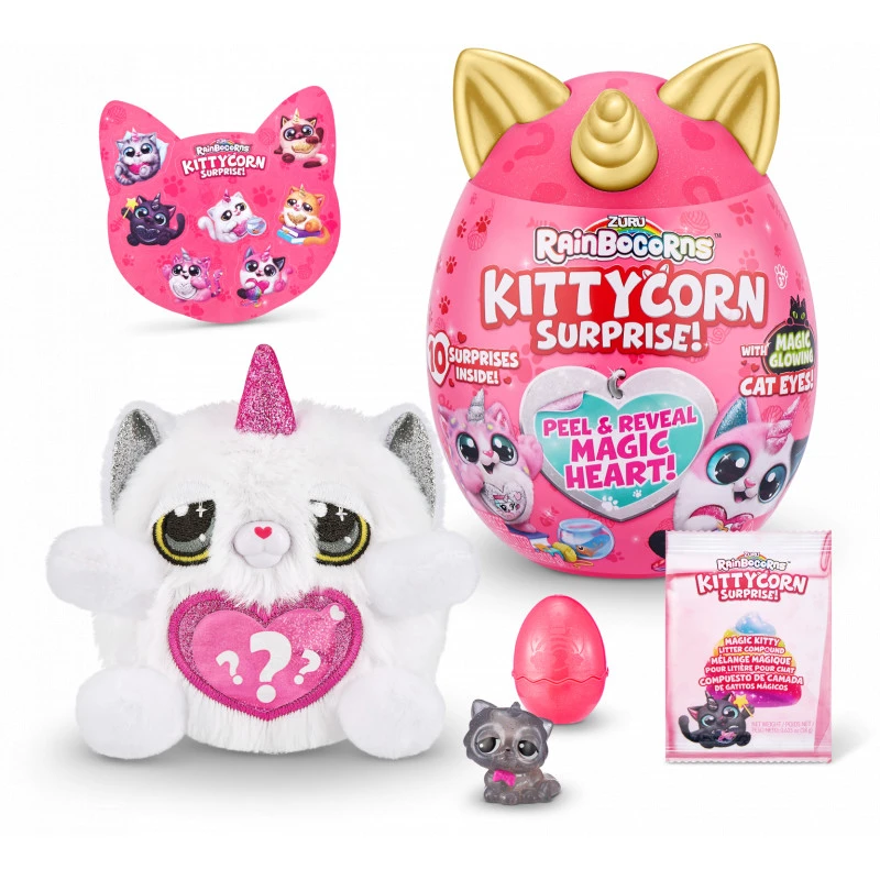 Meet the cutest kitties in Rainboville with Rainbocorns Kittycorn surprise! These cuddly kittycorns are packed with surprises you’ll want to open right meow! Pop open the Kittycorn egg to reveal a purrfect Kittycorns complete with stickers, collectors guide, Kittycorn Kitty Litter Compound and an oh so cute Kitty Boo-Boocorns! With 7 Kittycorns to collect will you adopt Lucky, Clover, Pippa or Dixie?! Peel’n’ reveal your Kittycorn’s heart to reveal what they love, then turn off the lights to watch their kitty eyes glow in the dark! These Kittycorns are packed with personality and can’t wait to be your new furry friend! Which kitty will you adopt?