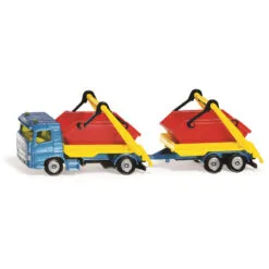 Whether sand, stone, or rubble – the HGV with skip and trailer carries a lot away! The tractor is a twin-axle HGV with a metal driver’s cab, and the trailer has a chassis with tandem axle and a metal platform. One skip each can be carried on the HGV and trailer. The lowering equipment on both parts of the vehicle is movable, and so the skips can easily be loaded on and off. Free-running wheels throughout the combination ensure mobility, and simplify manoeuvring. The bright red skips create an eye-catching contrast to the blue HGV with its yellow unloading arms. This bright and versatile vehicle combination will allow the re-enactment of innumerable construction site scenarios!