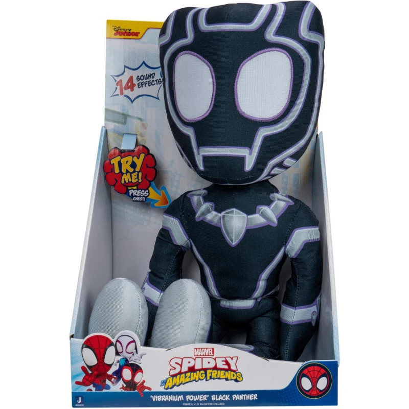 It’s Spidey Time! Swing into the latest Spidey adventure with the Black Panther 16-Inch Plush with sounds. Press the symbol on the Black Panther’s chest to activate one of 14 authentic phrases, including “I salute you, my friend,”and more! These featured catchphrases are straight from the amazing show, Marvel’s Spidey and his Amazing Friends, the new Marvel animated series. Team up with our Super Hero with this deluxe scale plush for amazing fun. Web-out!