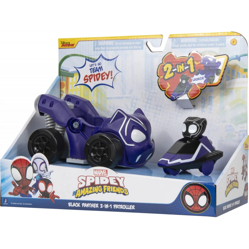 The Black Panther 2-in-1 Feature Vehicle is 2 vehicles in one! Press down on the back of the vehicle to launch the cycle into action – the front end of the vehicle splits open! It’s Spidey Time! Marvel’s Spidey and His Amazing Friends follows the adventures of the Super Hero Spidey and all his heroic friends! Spidey, Ghost-Spider, and Miles Morales: Spider Man all have super spider-powers: spider-sense, super-strength, wall-crawling, and more! Each brings something unique to their crime-fighting adventures, making them even stronger when they’re working together as the amazing Spider Team! But even the best team sometimes needs a helping hand that’s when it’s good to have allies like Ms. Marvel, Black Panther, and even Hulk! It’s hard being a Super Hero, but it helps when you have such Amazing Friends! Stopping bad guys and crawling walls Team Spidey does it all! Includes a built-in Spidey figure. Vehicle is approximately 6” long. Suitable for ages 3+.