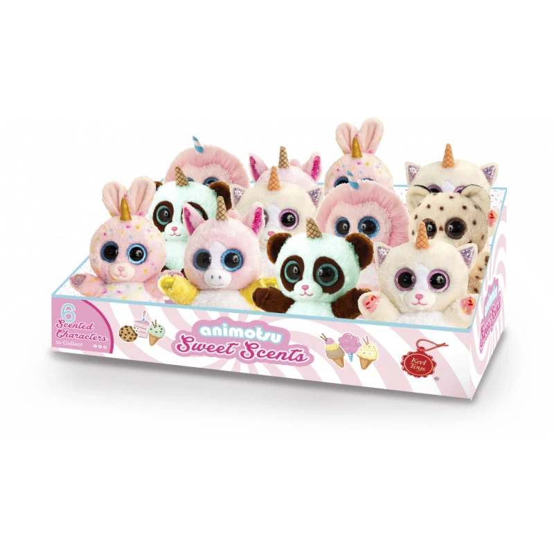 Meet the Animotsu Sweet Scents, these super soft multicoloured plush will captivate with their big sparkle eyes! Enjoy the delight of discovering each characters unique scent. Collect them all!
