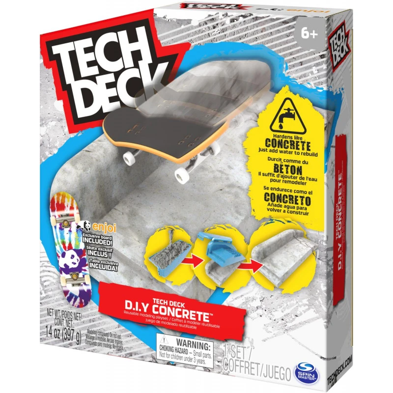 Build your own fingerboard obstacle course with the Tech Deck DIY Concrete Reusable Modeling skatepark! This set comes with everything you need to create your own skateboard ramps and rails, including 14oz of reusable concrete compound, ramp and rail molds, a molding tool, and an exclusive Enjoi Fingerboard! The DIY concrete is easy to use and reuse, great to use with mini skateboards for kids. Wet it, set it, and shred it! Simply add water, let it sit for 6-8 hours, and your creation will harden just like concrete. Use the molds to create perfect fingerboard ramps or create your own fingerboard skatepark to level up your skill. Simply add water to create new challenges. Challenge your friends, develop your skills, and build your Tech Deck collection with other toy figures & playsets. Tech Deck fingerboards are for skate-lovers ages 6 and up who love small toys. Create your own obstacles with the Tech Deck DIY Concrete Reusable Modeling Playset! Tech Deck mini skateboards for fingers and ramp sets make the perfect gift for girls toys age 6-8 who love small toys and cool toys or as an alternative to toy cars as a boys toys age 6-8 item. If you want real skate graphics from real skate companies, then it has got to be Tech Deck — start small, go big and collect them all! BUILD YOUR OWN OBSTACLES: The DIY Concrete Reusable Modeling Skatepark has everything you need to create your own fingerboard obstacles. Featuring reusable concrete, ramp and rail molds, an exclusive Enjoi Fingerboard and more! EASY REUSABLE CONCRETE: Includes 14oz of reusable concrete compound! Pat the concrete sand into the mold or create your own obstacles! Add water, set it for 6-8 hours and it will harden like concrete. Place in water again to rebuild! EXCLUSIVE ENJOI FINGERBOARD: Add to your finger skateboard collection and skate your creation with the exclusive Enjoi Skateboards fingerboard included in the set. Real skateboard graphics from real skate brands. ENDLESS COMBINATIONS: Use the modeling concrete to create different scenes and obstacles. This finger skateboard kit is perfect for training hand-eye coordination and showing off new fingerboard tricks to your friends. COLLECT THEM ALL: Great toys for boys or toys for girls and gifts for kids that love collectibles, toy figures & playsets, or mini skateboards. Great Christmas gift, or birthday gifts ages 6 and up!