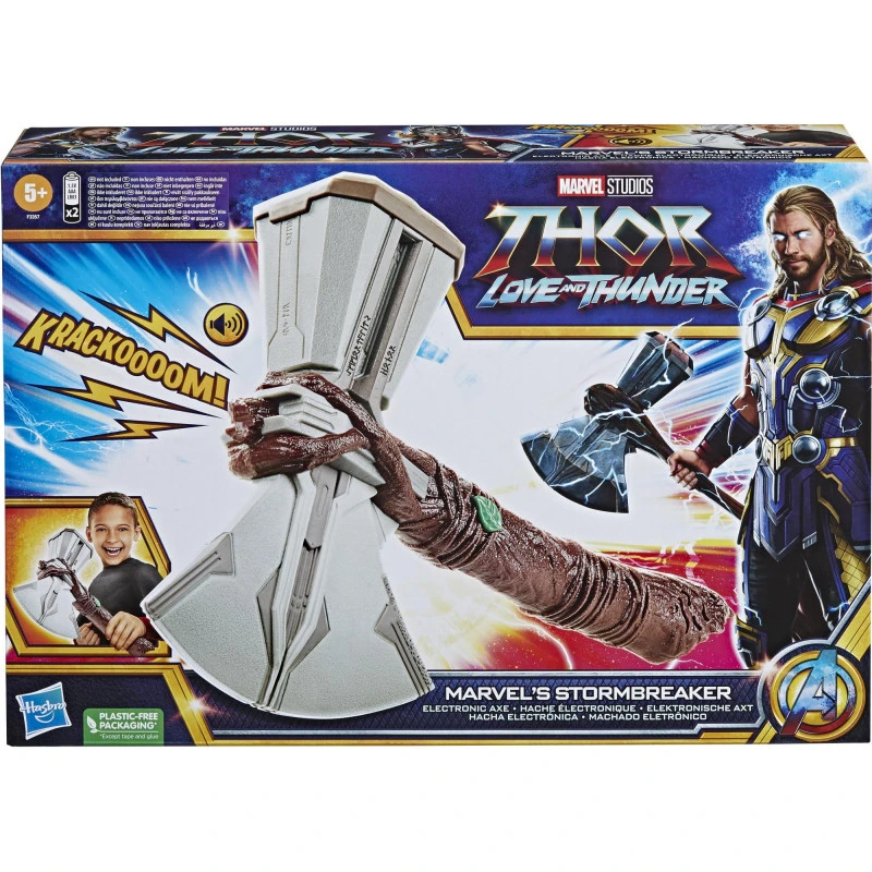 Thor uses his powers to protect New Asgard and fight off new enemies! After the destruction of his hammer, Mjolnir, Stormbreaker was forged. Kids ages 5 and up can pretend to gear up to protect the cosmos from an evil threat with this electronic roleplay toy, inspired by Marvel Studios’ Thor: Love and Thunder, part of the Marvel Cinematic Universe! With the push of a button on the axe toy’s handle they can activate exciting thunder sound FX. With the Marvel’s Stormbreaker Electronic Axe, aspiring heroes can imagine joining the battle to save not only the world, but the entire universe! Copyright 2022 MARVEL. Hasbro and all related terms are trademarks of Hasbro.